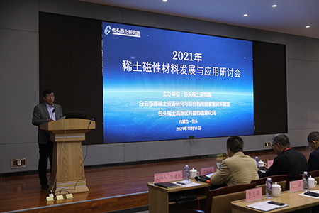 10月11日,由包头稀土研究院、白云鄂博稀土资源研究与综合利用国家重点实验室、包头稀土高新区科技和信息化局主办的“2021年稀土磁性材料发展与应用研讨会”在包头稀土研究院召开。包钢磁材、金蒙汇磁、韵升强磁、天和磁材等30余家磁性材料上下游相关企业及科研院所的行业专家及代表共100余人参加了会议。会议由包头稀土研究院党委书记、常务副院长陈建利主持。中国北方稀土(集团)高科技股份有限公司董事长、党委书记李金玲出席会议并致辞。中国北方稀土(集团)高科技股份有限公司总经理、党委副书记、包头稀土研究院董事长瞿业栋,包头市稀土高新区科技和信息化局副局长刘相利出席了本次会议。