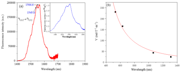Er:CeF3晶体的荧光光谱曲线(a)和Verdet随波长的变化曲线(b)