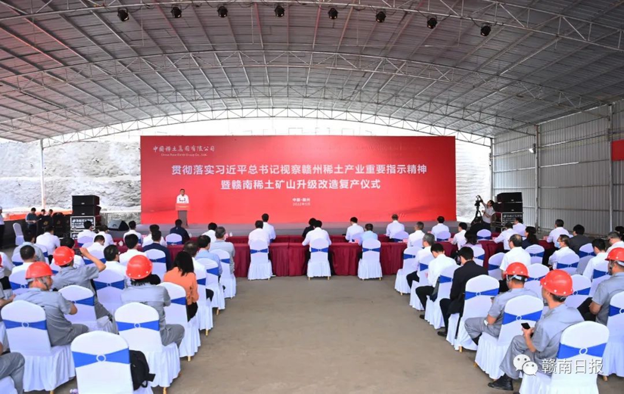 江西省委副书记、赣州市委书记吴忠琼出席并宣布启动复产。江西省委常委、副省长任珠峰讲话。江西省政府副秘书长熊科平,江西省科技厅厅长犹,江西省生态环境厅厅长徐延彬,江西省国资委副主任马健,江西省地质局党组书记宋斌等省直相关厅局负责同志出席活动。赣州市领导胡剑飞,中国稀土集团党委书记、董事长敖宏分别致辞。中国稀土集团党委副书记、总经理刘雷云主持并介绍赣南稀土矿山升级改造复产工作情况。