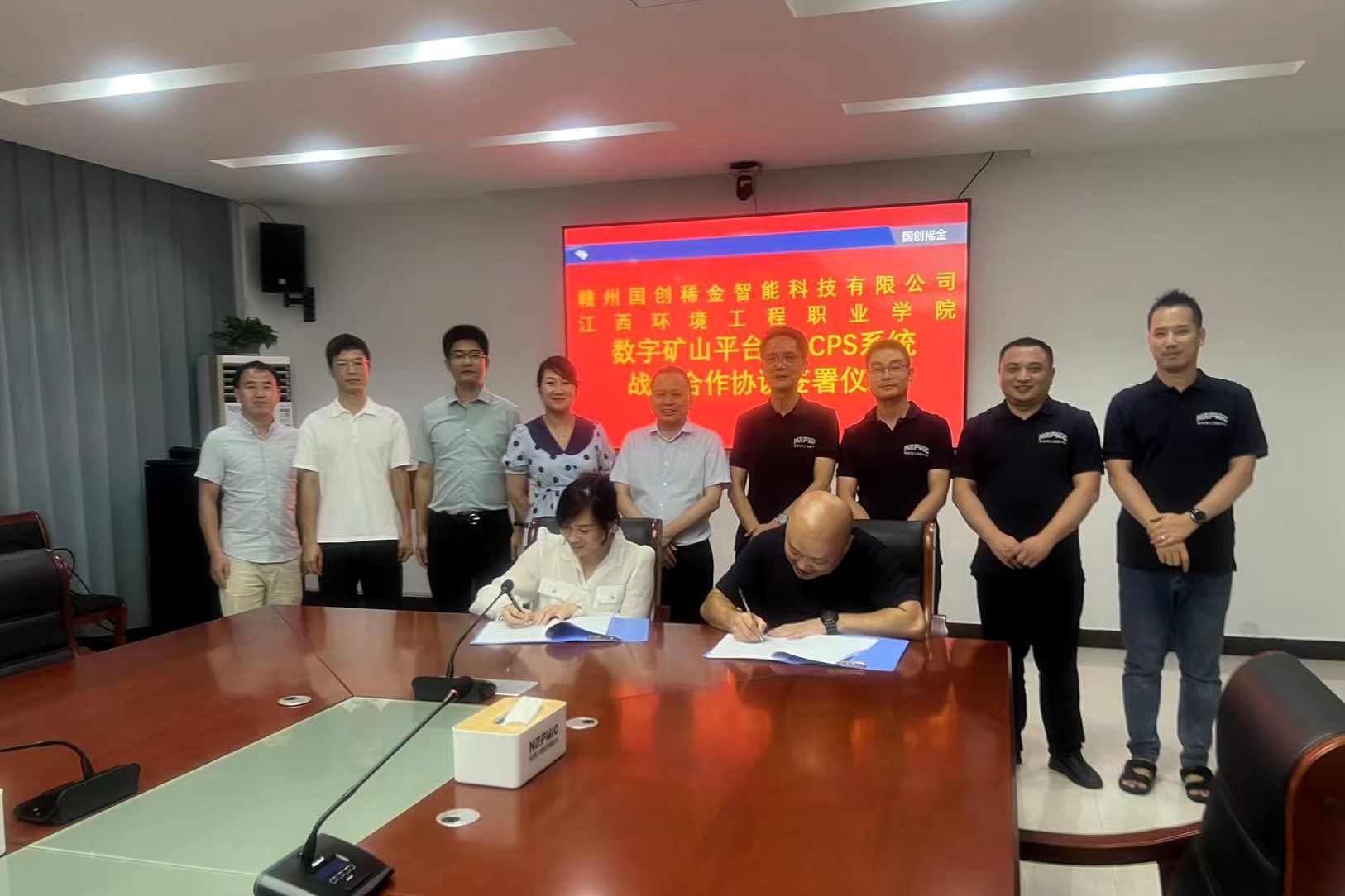8月9日,江西环境工程职业学院党委书记肖忠优一行莅临国家稀土功能材料创新中心考察交流,稀土功能材料智能制造及信息化技术创新平台负责人、赣州国创稀金智能科技有限公司总经理吴晓东代表中心稀土功能材料智能制造及信息化技术创新平台与江西环境工程职业学院签订数字矿山平台CPS系统战略合作协议,双方将在稀土产业智能制造、数字化矿山建设方面开展深度合作。