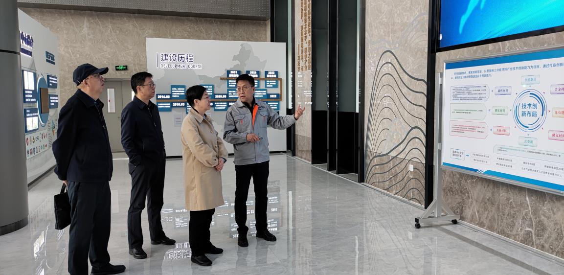 4月13日,内蒙古自治区工业和信息化厅副厅长胡瑞芬、电子科技处处长彭武华、包头市工业和信息化局副局长郭玉明一行莅临国家稀土功能材料创新中心参观调研并进行座谈交流,国创中心总经理刘威及相关部门负责人陪同调研。